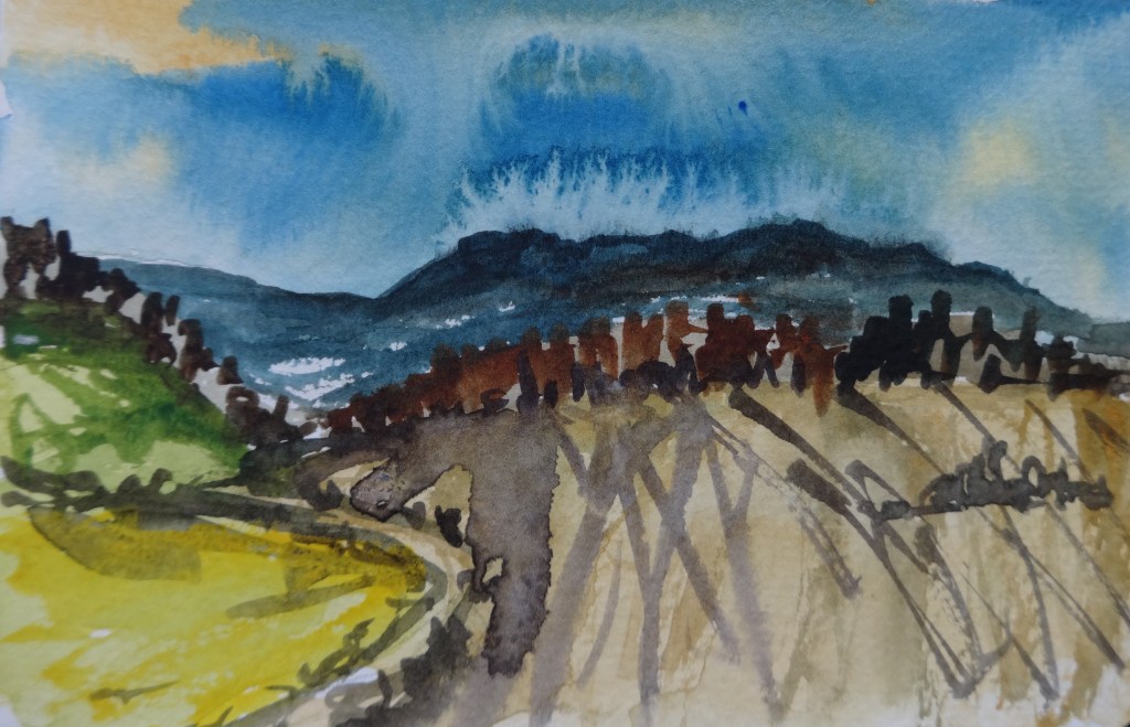 During the last few years Georgina has been walking in the South Shropshire hills producing a series of en plein-air sketches that have proved to be a highly inspirational and challenging experience. In addition, studies of rocks and craggy formations have also stimulated depictions of geological drama that have spectacular structure and variety of rock types, strata, faults, colour and texture. These practices feed and inform her studio paintings.